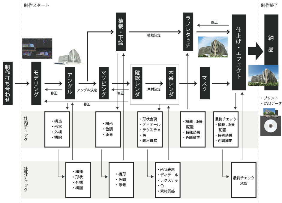 制作に関する資料や図面を拝見します。お客様のイメージされたもの、あるいは設計コンセプトをしっかりとヒアリングし、納得のいく表現でCGパースを提供することが可能です。